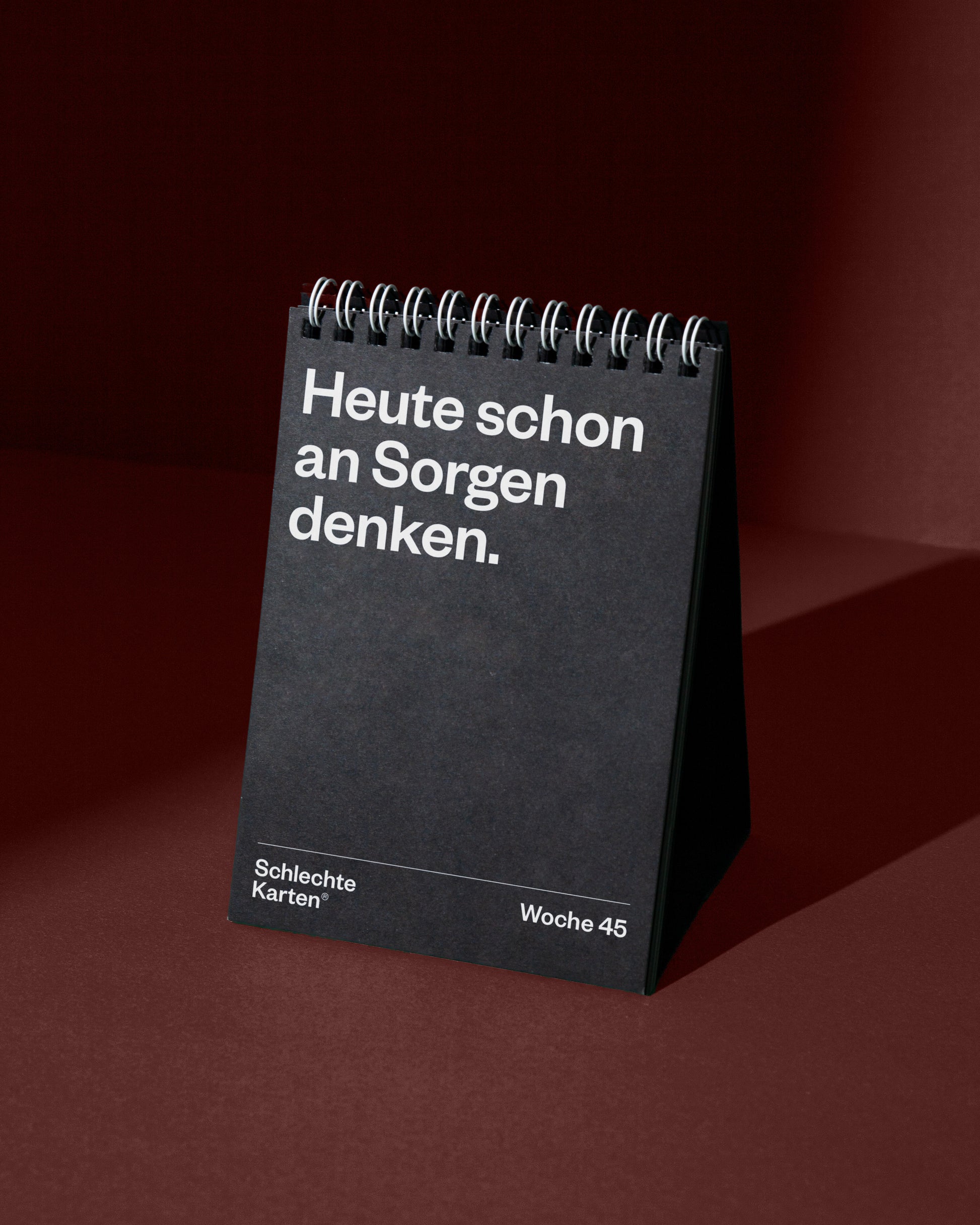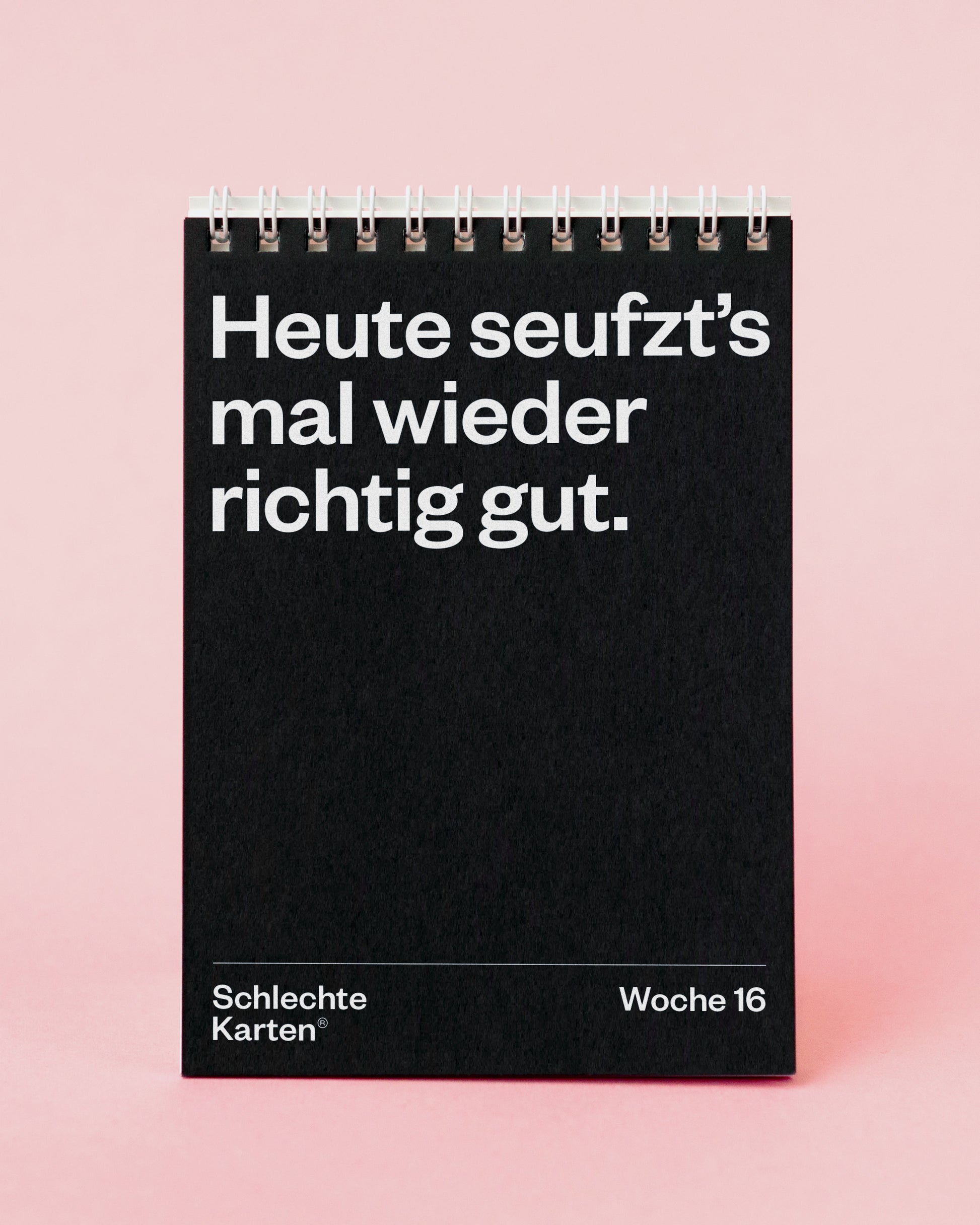 Sorry – bei all dem können wir dir auch nicht helfen. Dafür haben wir etwas viel Besseres: Schlechte Karten. Humorvolle Designprodukte gegen den Selbstoptimierungswahn. Von witzigen Postkarten über Tisch- und Wandkalender bis zum Duftkerzen-Downer. Mach dir selbst ein Geschenk – oder anderen eine Lektion in Demotivation.