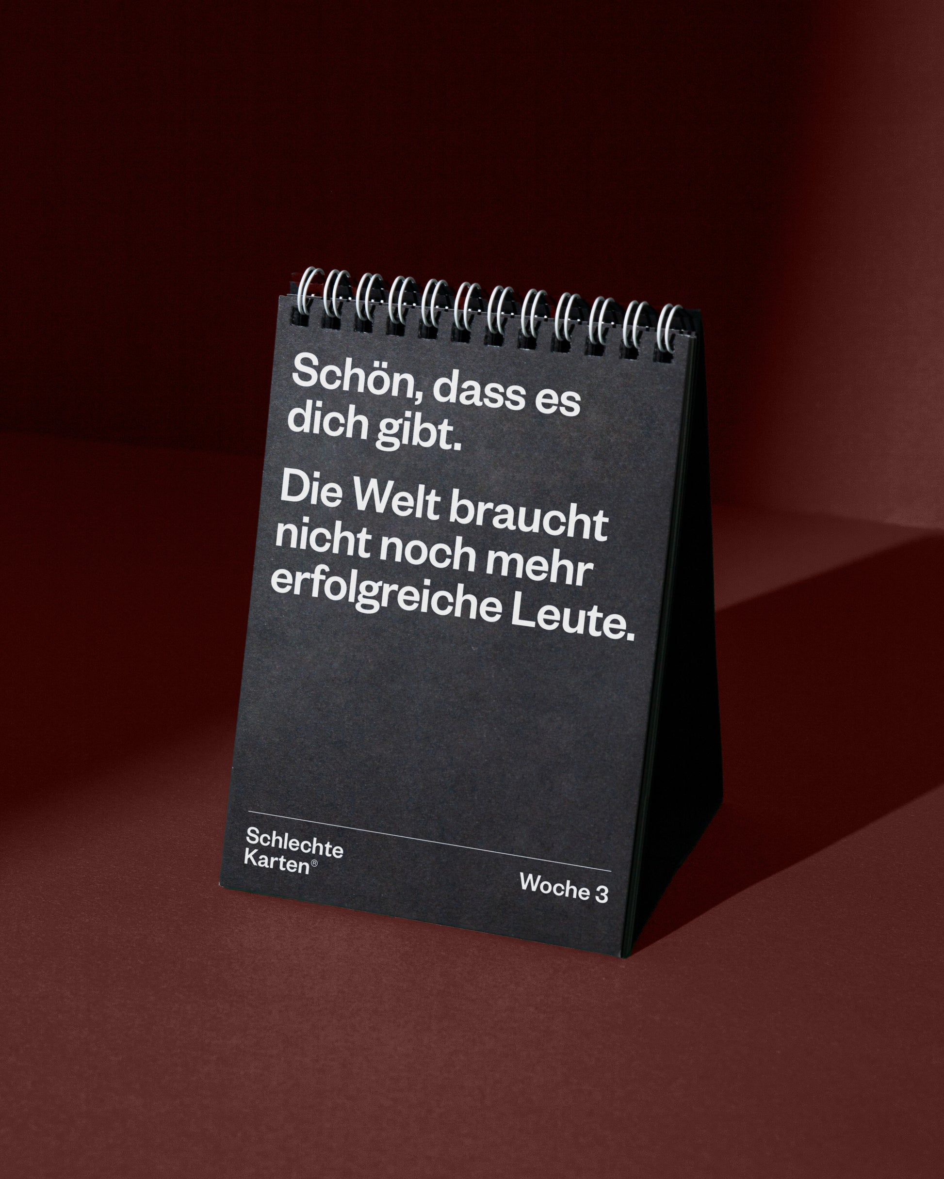 Sorry – bei all dem können wir dir auch nicht helfen. Dafür haben wir etwas viel Besseres: Schlechte Karten. Humorvolle Designprodukte gegen den Selbstoptimierungswahn. Von witzigen Postkarten über Tisch- und Wandkalender bis zum Duftkerzen-Downer. Mach dir selbst ein Geschenk – oder anderen eine Lektion in Demotivation.