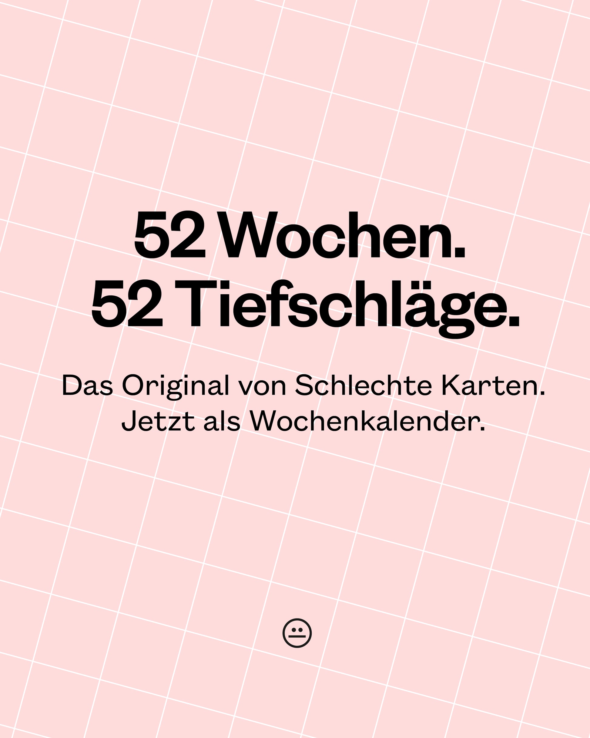 Deshalb haben wir den weltweit ersten demotivierenden Tischkalender jetzt noch besser gemacht. Noch schonungsloser. Noch demotivierender. Jetzt gibt’s die volle Packung: 52 Wochen, 52 neue Tiefschläge – liebevoll gestaltet, nachhaltig produziert und garantiert frei von motivierenden Parolen.