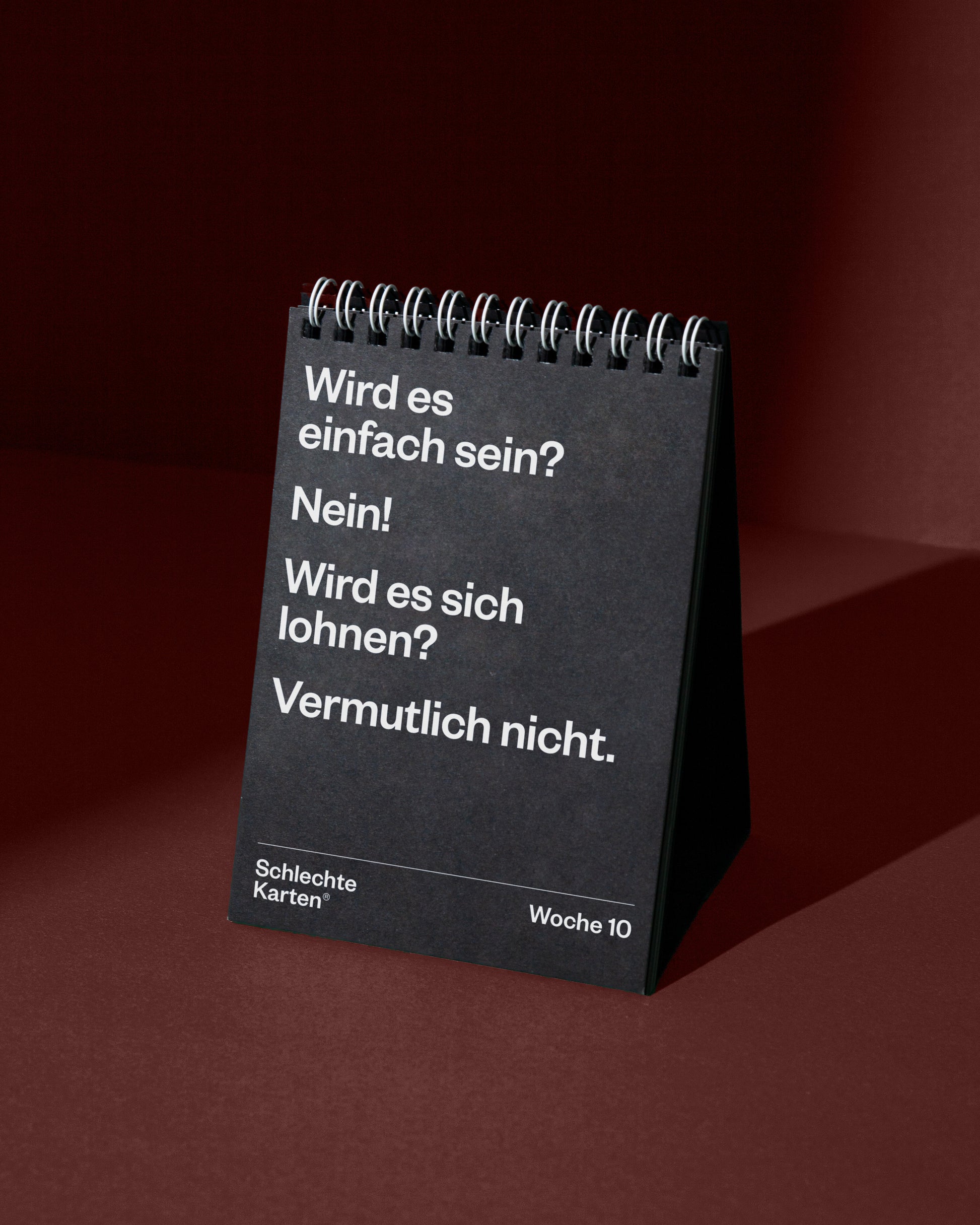 Deshalb haben wir den weltweit ersten demotivierenden Tischkalender jetzt noch besser gemacht. Noch schonungsloser. Noch demotivierender. Jetzt gibt’s die volle Packung: 52 Wochen, 52 neue Tiefschläge – liebevoll gestaltet, nachhaltig produziert und garantiert frei von motivierenden Parolen.